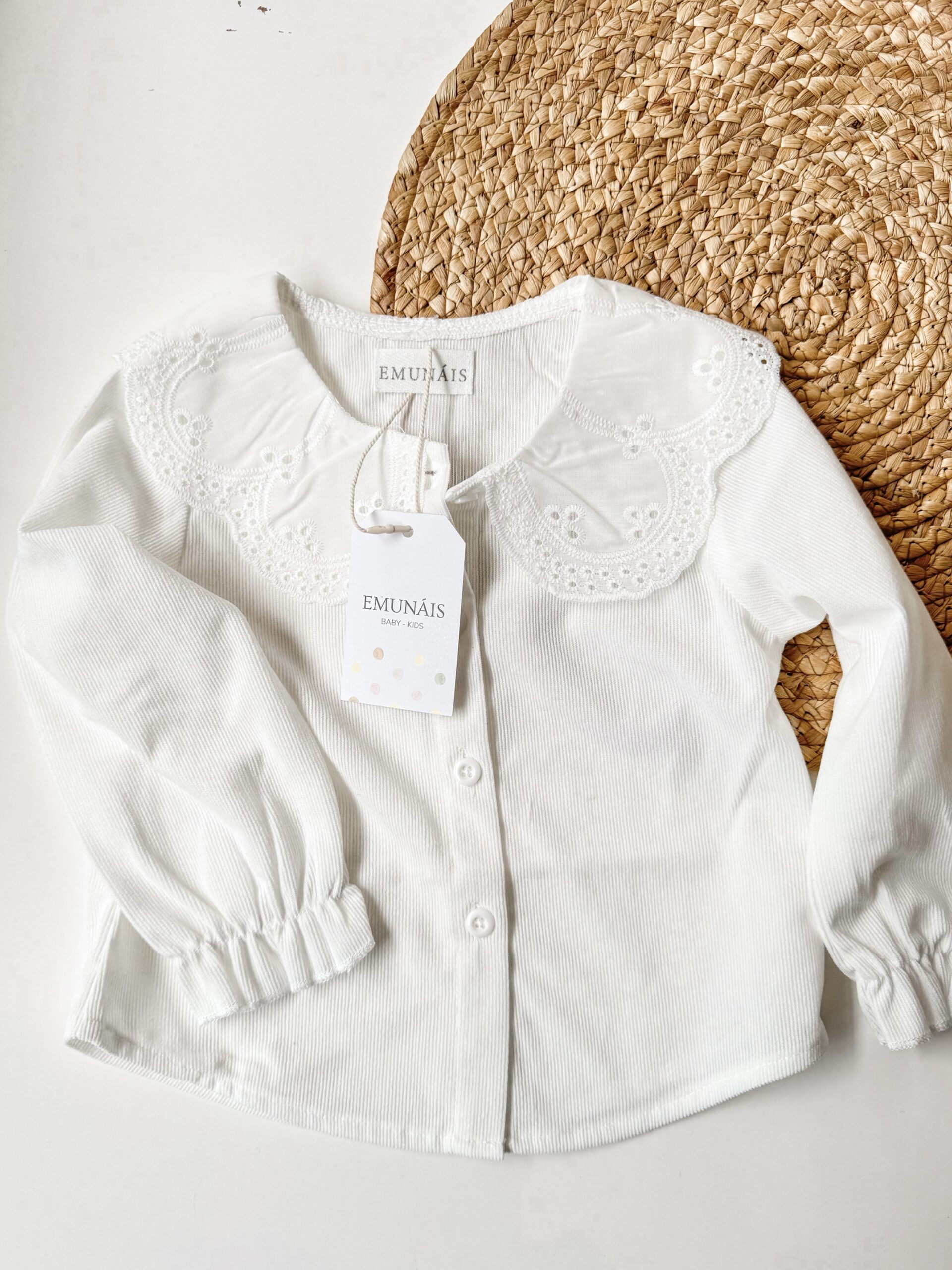 Confeccionada en un suave bitle blanco, esta blusa destaca por su hermoso cuello bordado estilo babero, perfecto para darle un toque elegante y romántico a cualquier look.